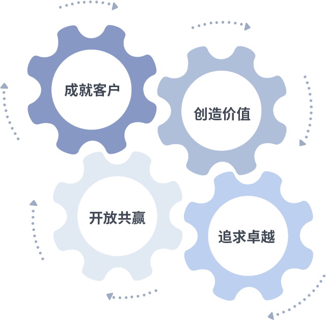 成就客户是一切决策的出发点,,,,创造价值是衡量所有工作的标准,,,追求卓越是我们做事做人的态度,,,开放共赢是我们的格局也是最终的结果。。。。价值观的齿轮环环相扣,,,,推动着组织里的每个人不断向前。。